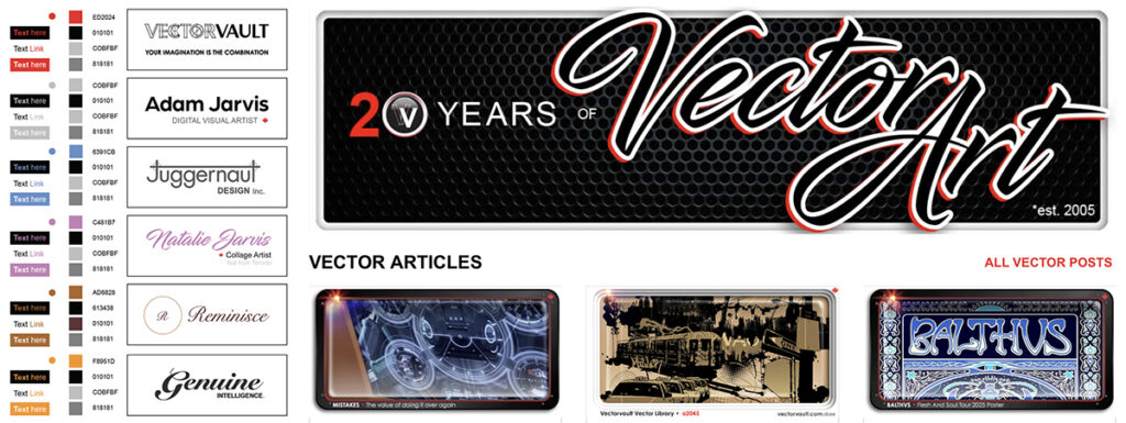As part of a bigger vision, Vectorvault is connected to a family of Partners. Each represent a different aspect of the parent company Juggernaut Illustration and Design Inc. To keep these properties segmented and connected, we have developed a sidebar navigation that puts it all under one roof.